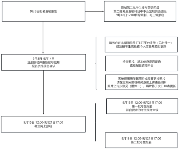 根据教育部考试中心安排,考生须在9月15日前在ETEST平台注册(见附件一),已注册考生需检查个人信息并及时更新,并在规定时间内登录CET全国网上报名系统(网址:http://cet-bm.neea.edu.cn),完成注册、报名、缴费等相关工作。